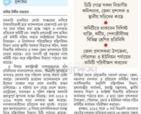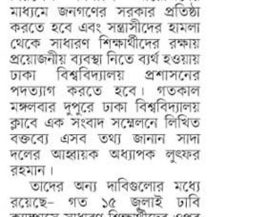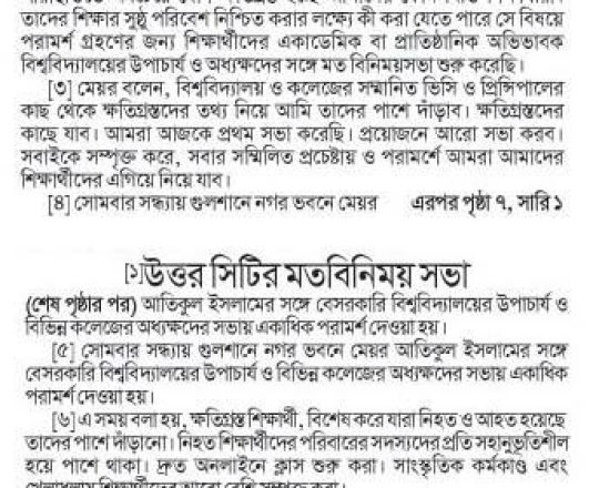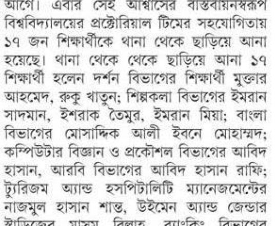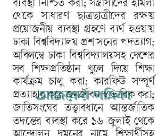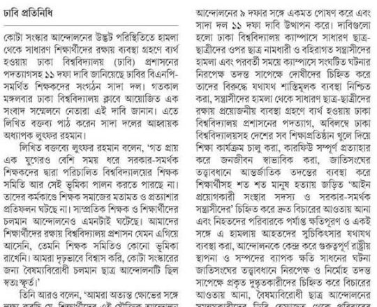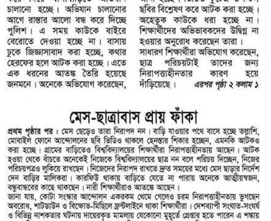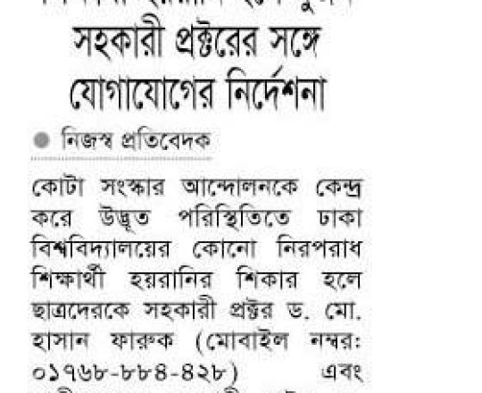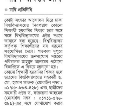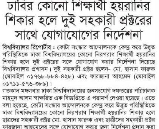 আজকালের খবর, ৩১ জুলাই ২০২৪, ঢাবির কোনো নিরপরাধ শিক্ষার্থী হয়রানি হলে দুজন সহকারী প্রক্টরের সঙ্গে যোগাযোগের নির্দেশনা