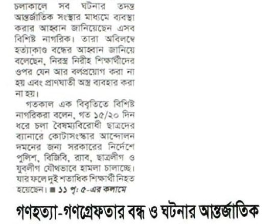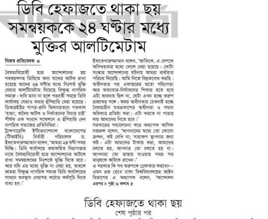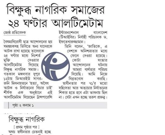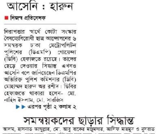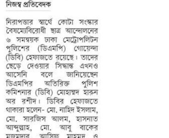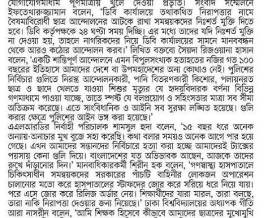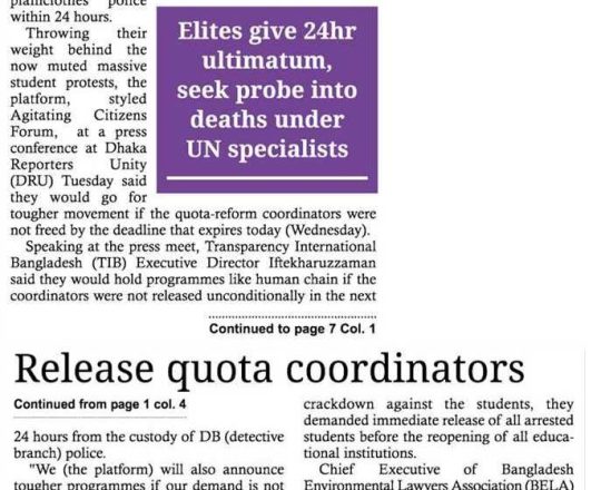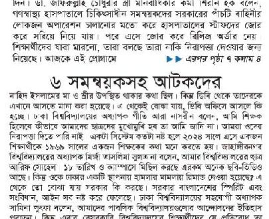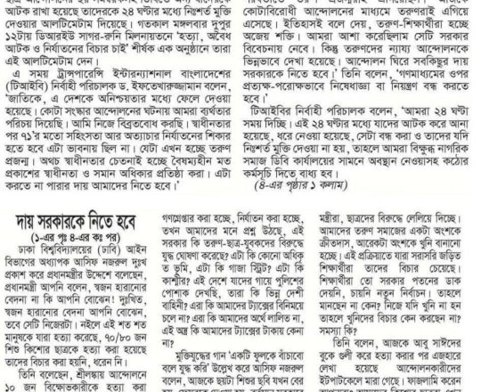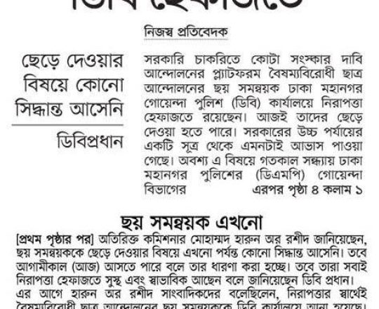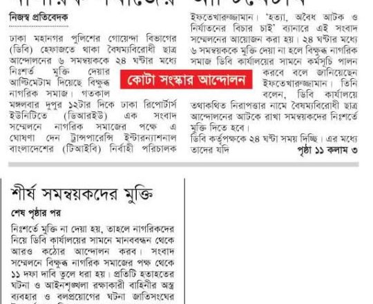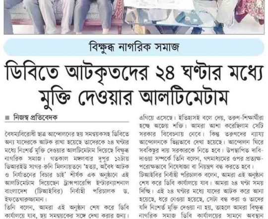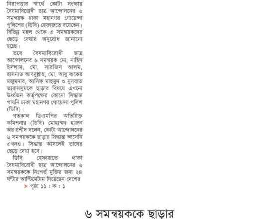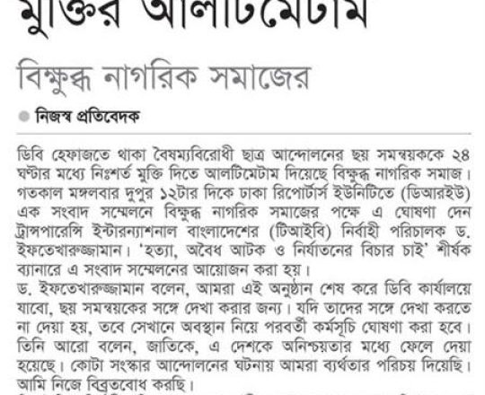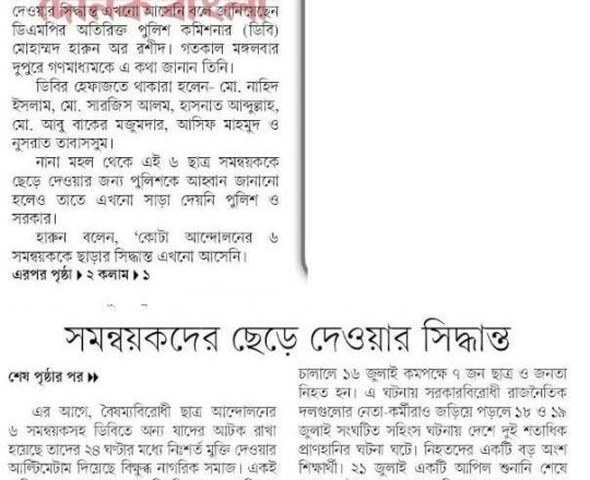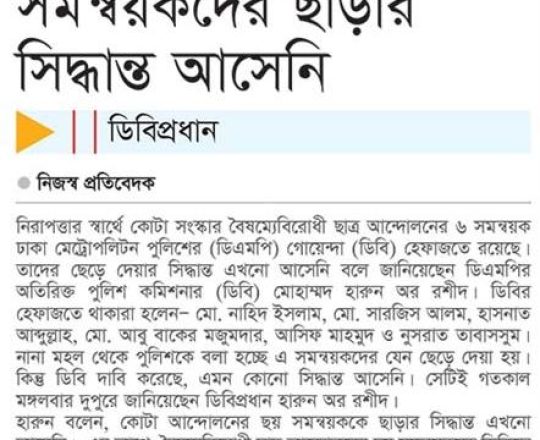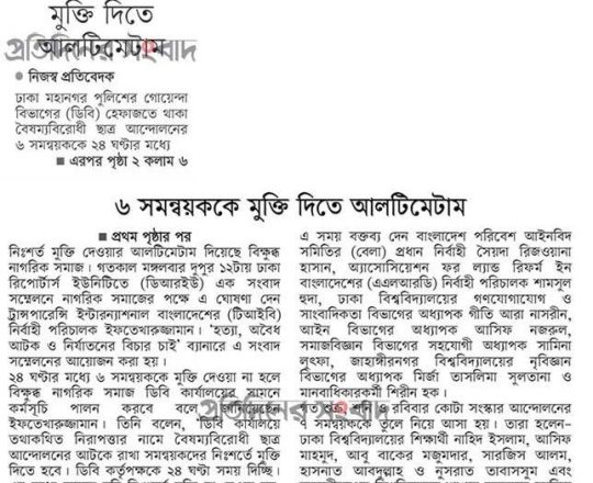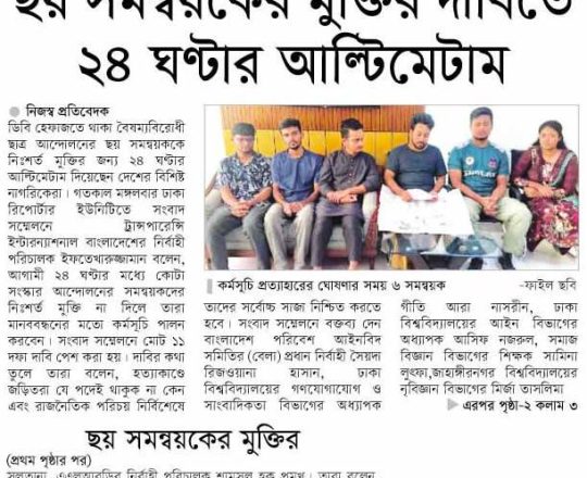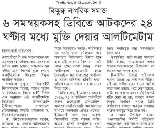 প্রথম আলো,৩১ জুলাই,৬ সমন্বয়ককে ২৪ ঘণ্টার মধ্যে মুক্তি দিতে 'বিক্ষুব্ধ নাগরিক সমাজের' আলটিমেটাম