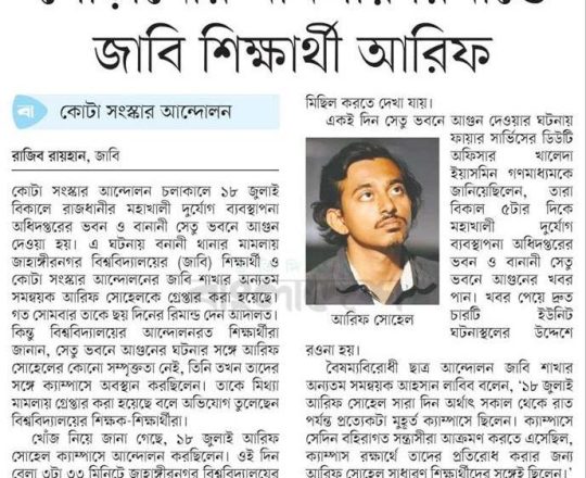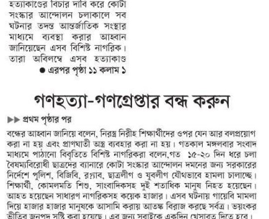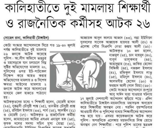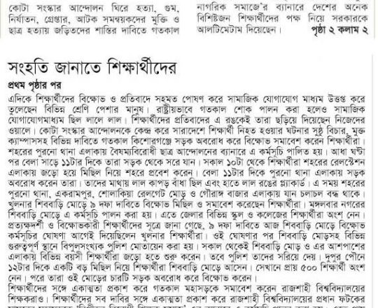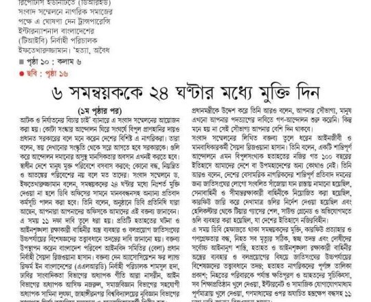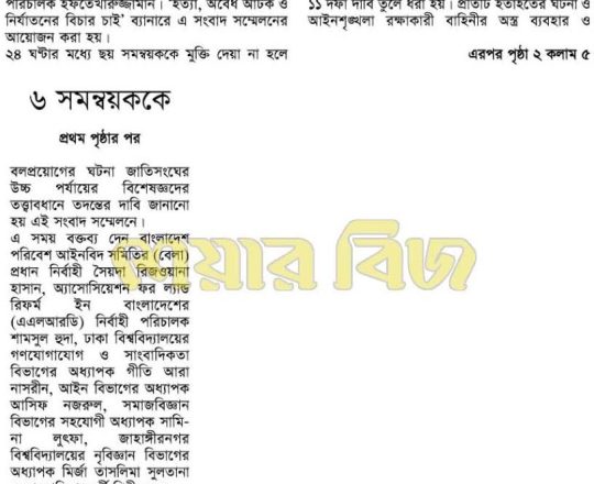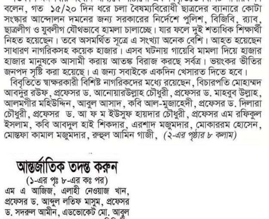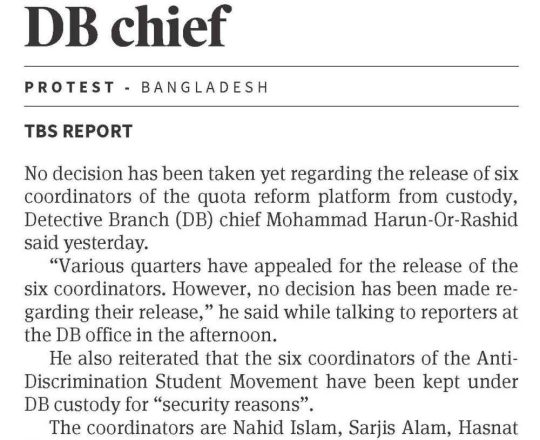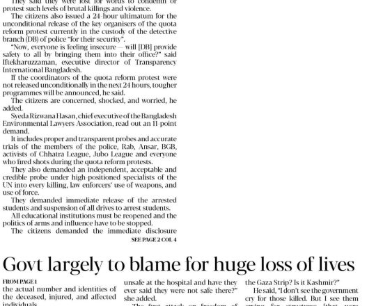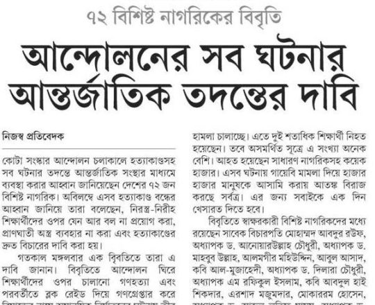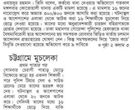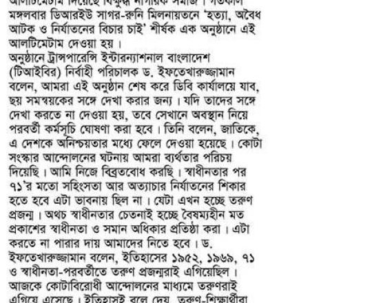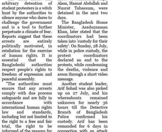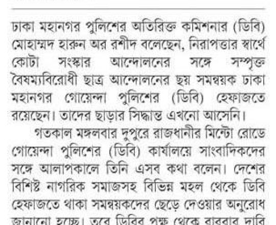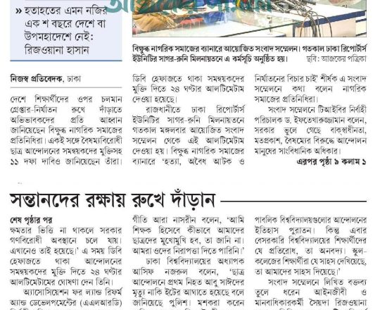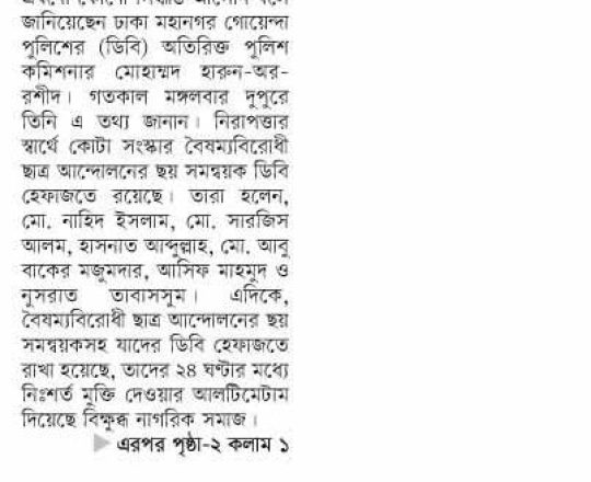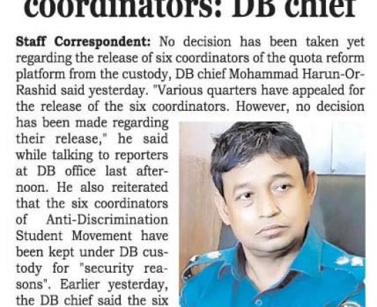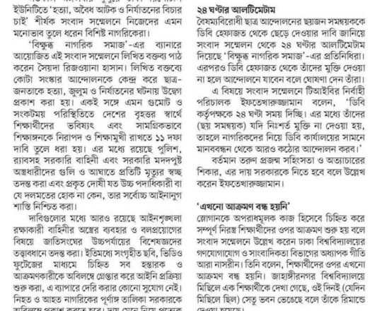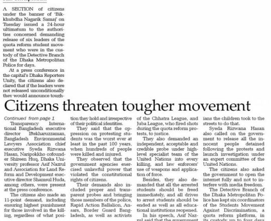 প্রথম আলো,৩১ জুলাই,৬ সমন্বয়ককে ২৪ ঘণ্টার মধ্যে মুক্তি দিতে 'বিক্ষুব্ধ নাগরিক সমাজের' আলটিমেটাম