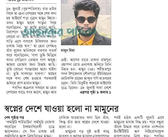 আজকের পত্রিকা, ৩১ জুলাই ২০২৪, স্বপ্নের দেশে যাওয়া হলো না মামুনের