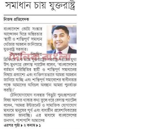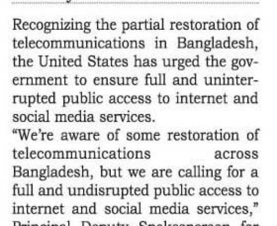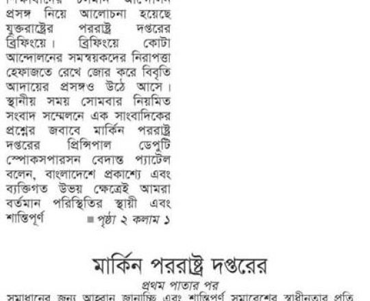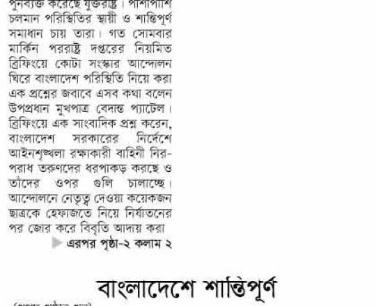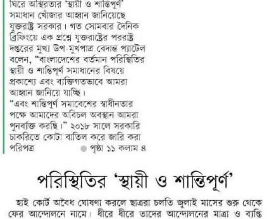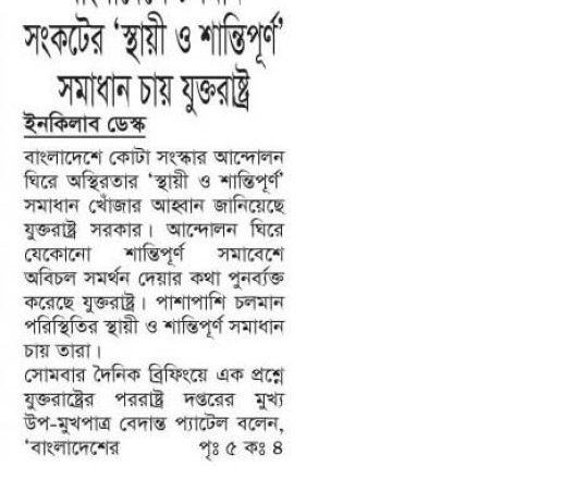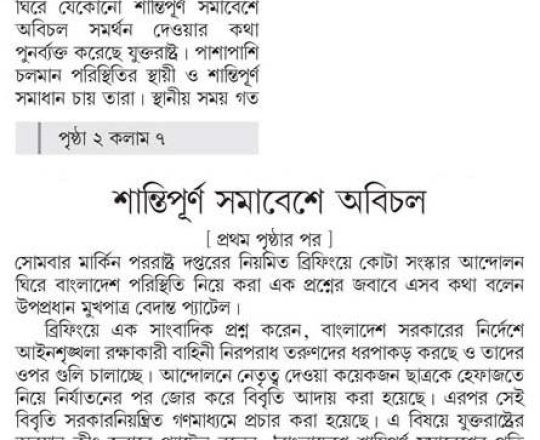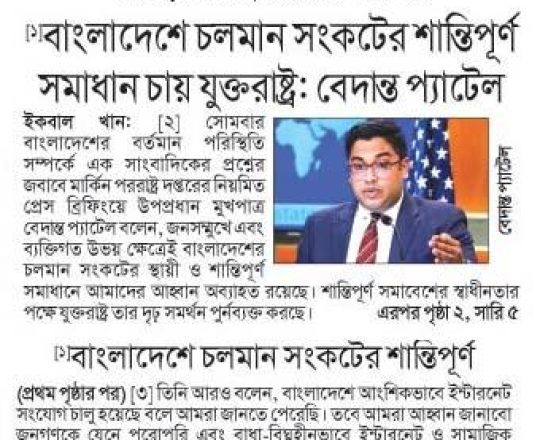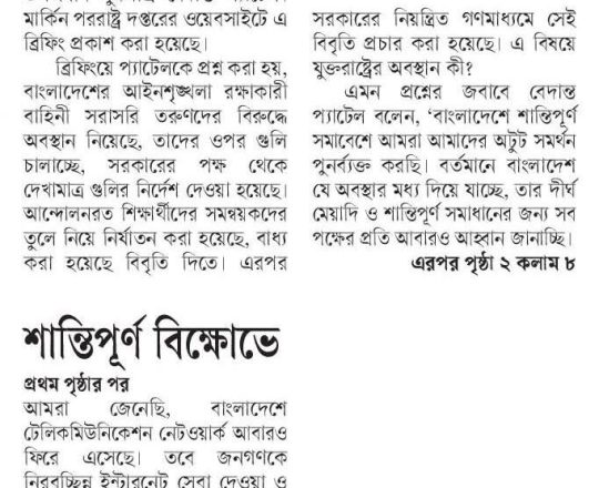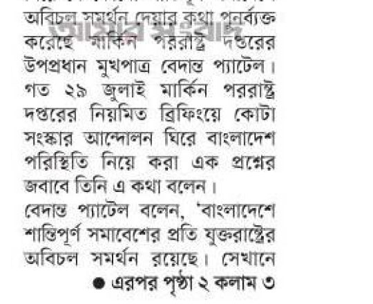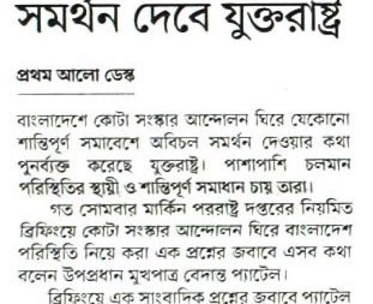 প্রথম আলো,৩১ জুলাই, বাংলাদেশে শান্তিপূর্ণ সমাবেশে অবিচল সমর্থন দেবে যুক্তরাষ্ট্র: পররাষ্ট্র দপ্তর