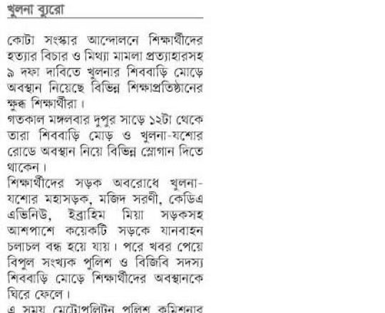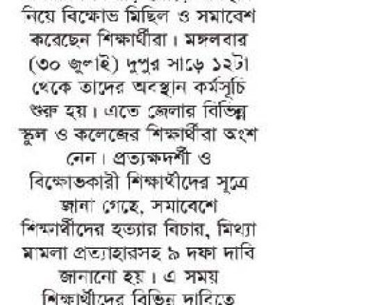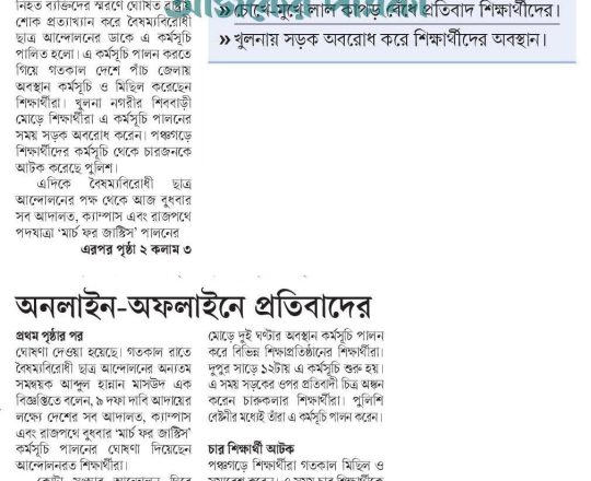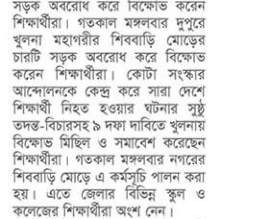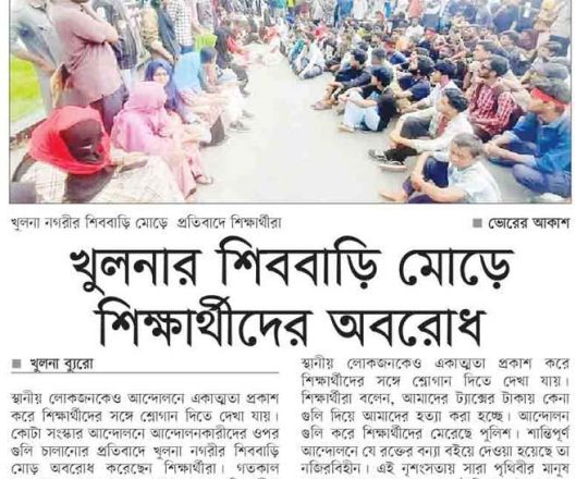প্রথম আলো,৩১ জুলাই,৯ দফা দাবিতে খুলনার শিববাড়ি মোড় অবরোধ করে শিক্ষার্থীদের বিক্ষোভ