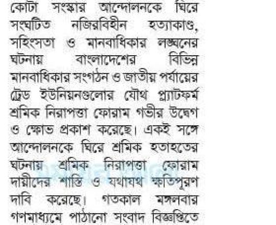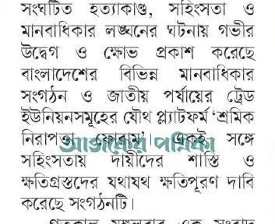 আজকের পত্রিকা, ৩১ জুলাই ২০২৪, শ্রমিক হতাহতের ঘটনায় নিরাপত্তা ফোরামের উদ্বেগ