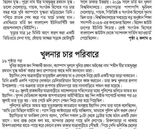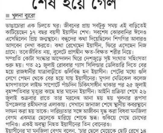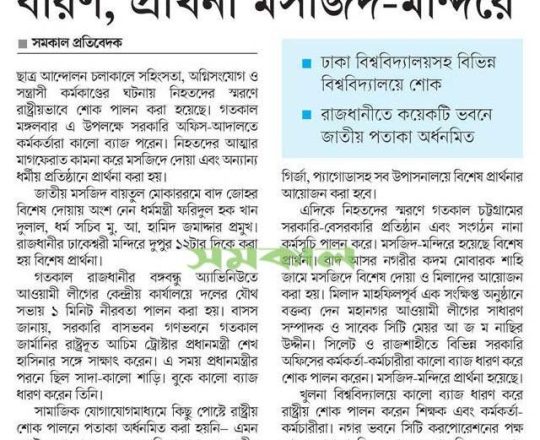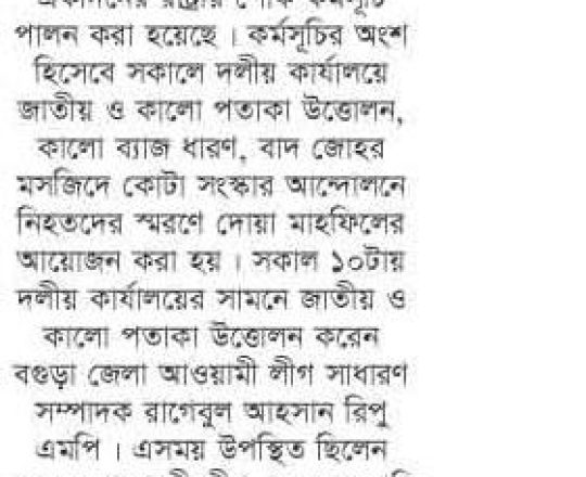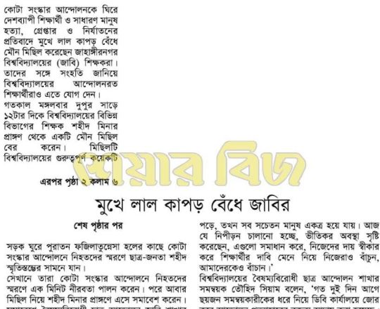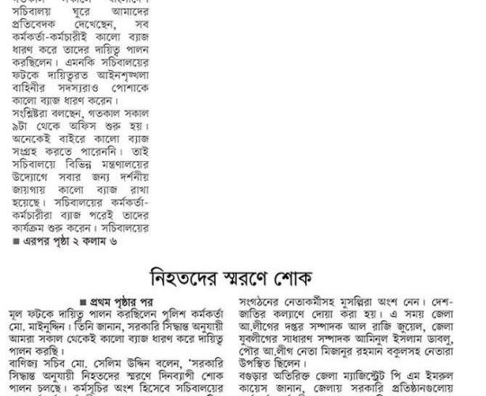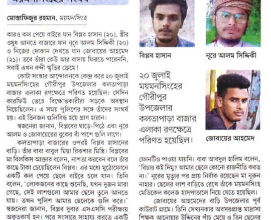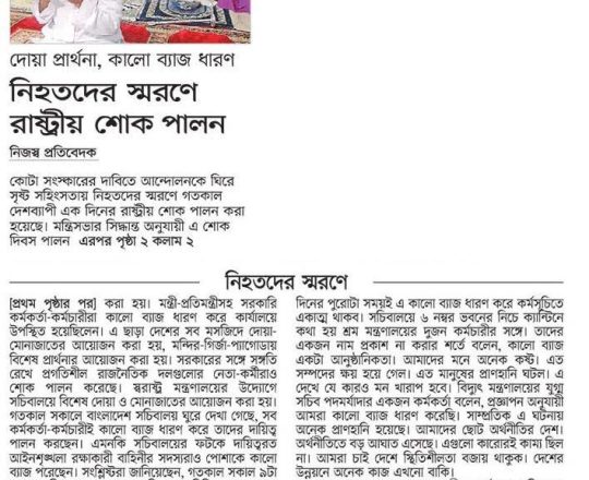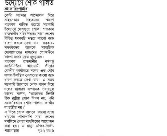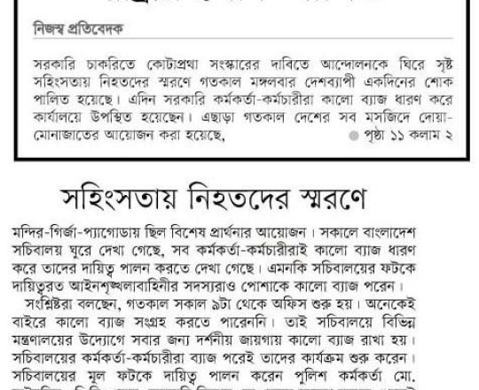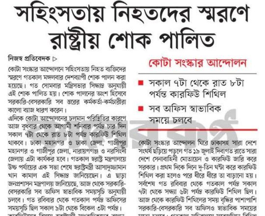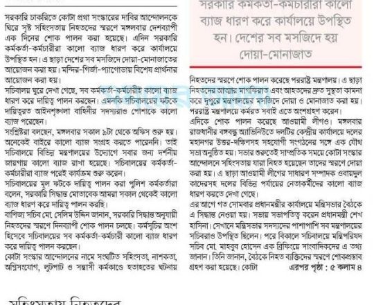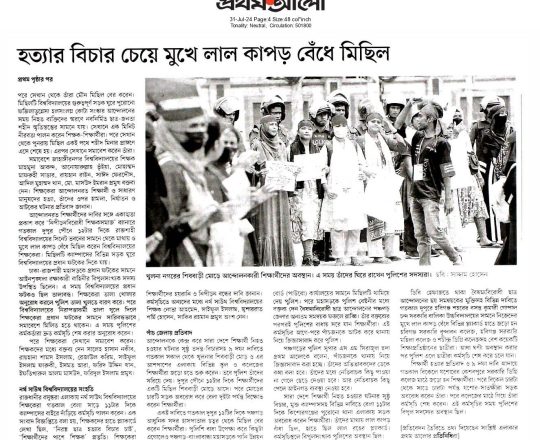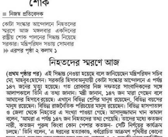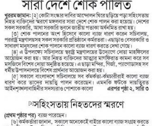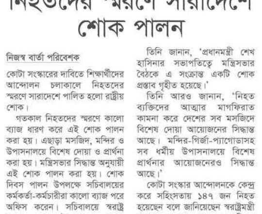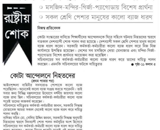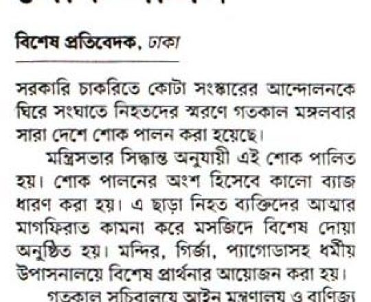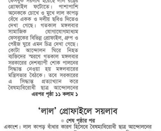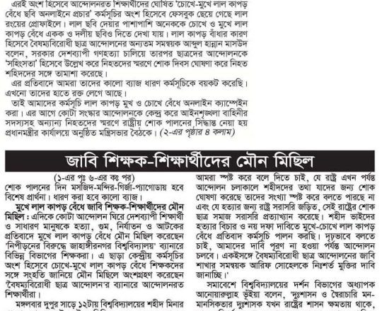 প্রথম আলো,৩১ জুলাই, কোটা আন্দোলনে নিহতদের স্মরণে সারা দেশে শোক পালিত হচ্ছে