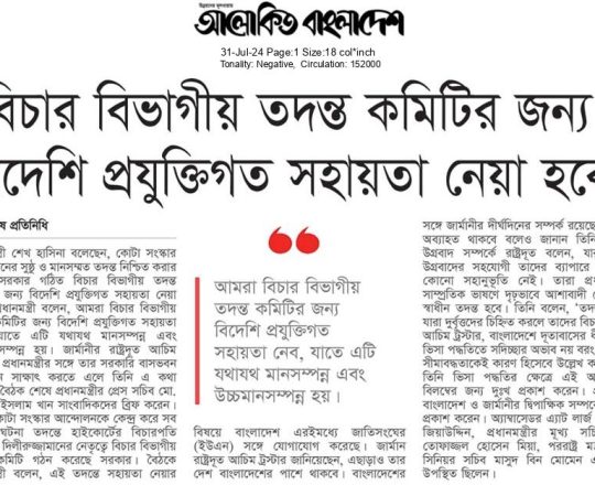 আলোকিত বাংলাদেশ, ৩১ জুলাই ২০২৪, 'বিচার বিভাগীয় তদন্ত কমিটির জন্য বিদেশি প্রযুক্তিগত সহায়তা নেয়া হবে'