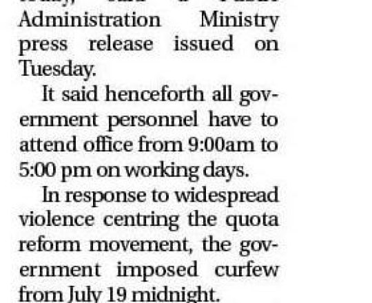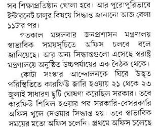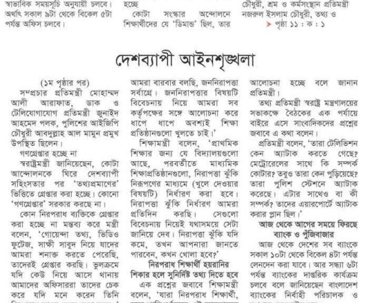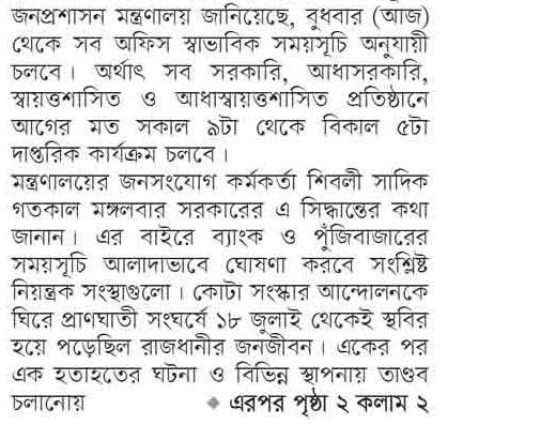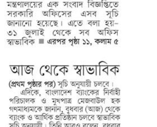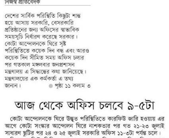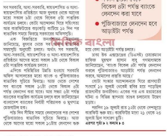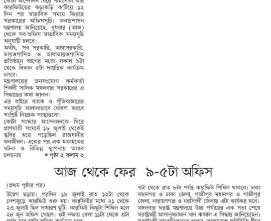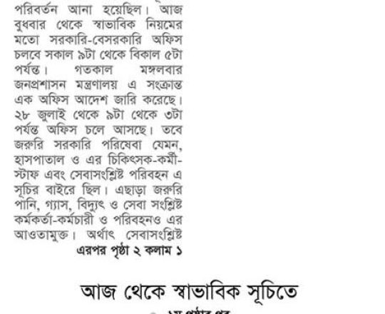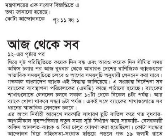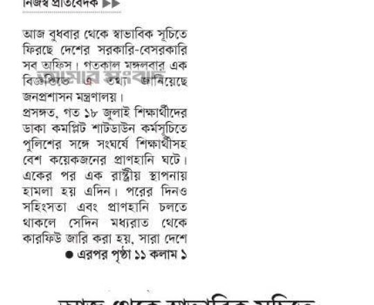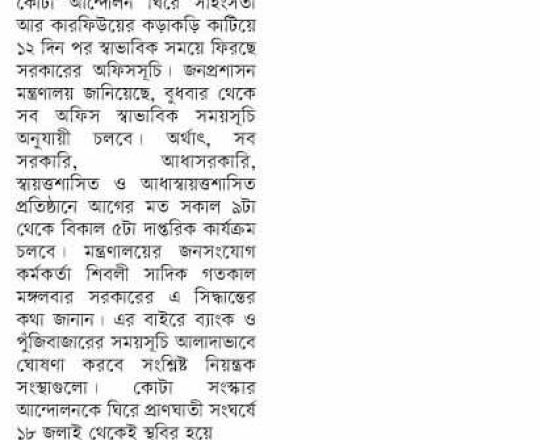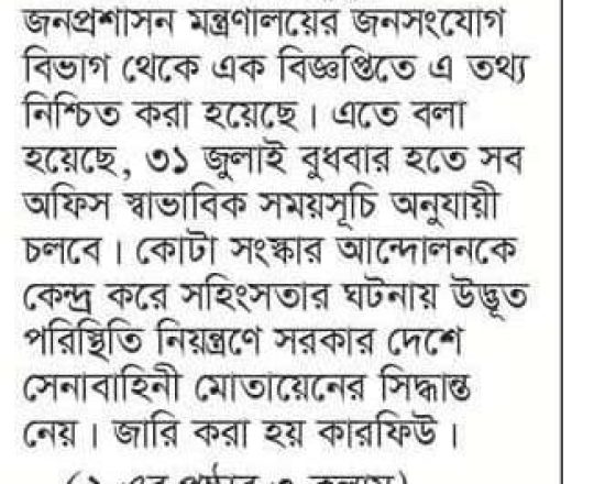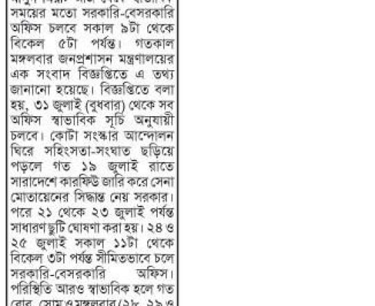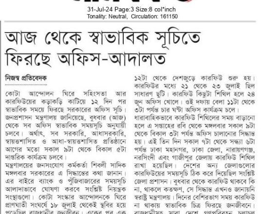 আজকের পত্রিকা, ৩১ জুলাই ২০২৪, অফিস আজ থেকে স্বাভাবিক সূচিতে