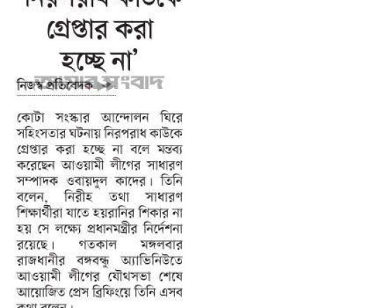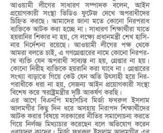 আলোকিত বাংলাদেশ, ৩১ জুলাই ২০২৪, কোনো নিরপরাধ ব্যক্তিকে আটক করা হচ্ছে না-ওবায়দুল কাদের