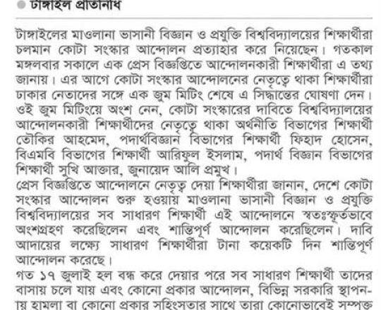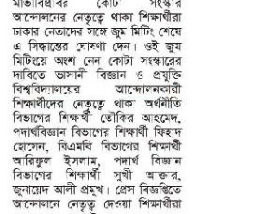 ভোরের পাতা, ৩১ জুলাই ২০২৪, ফরিদপুরে বৈষম্যবিরোধী ছাত্র আন্দোলনের কর্মসূচি প্রত্যাহার