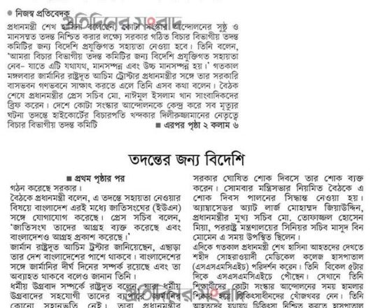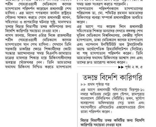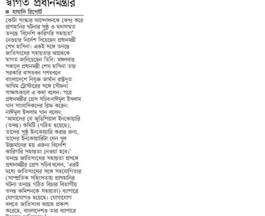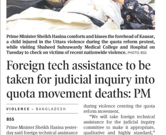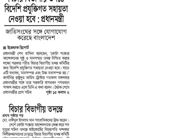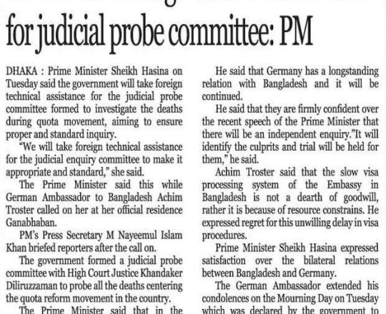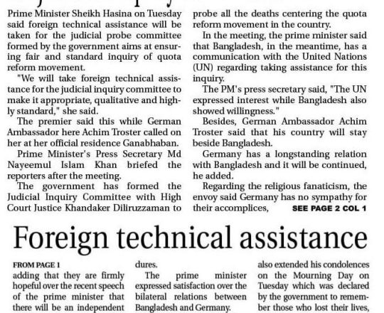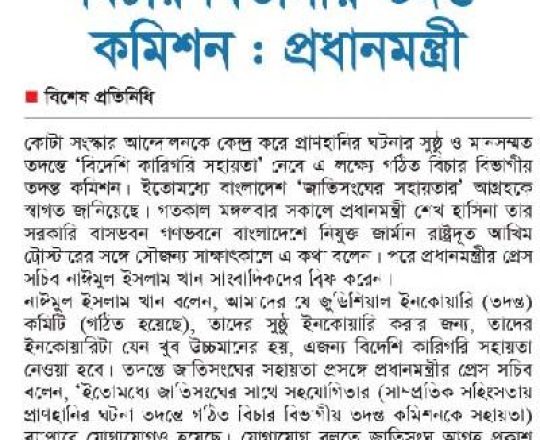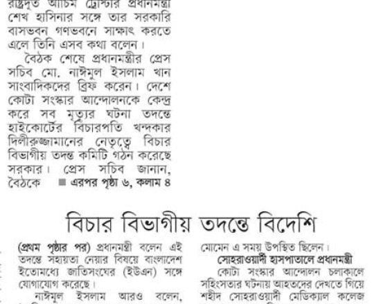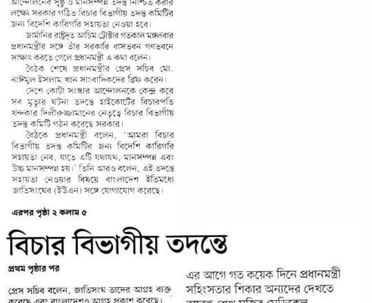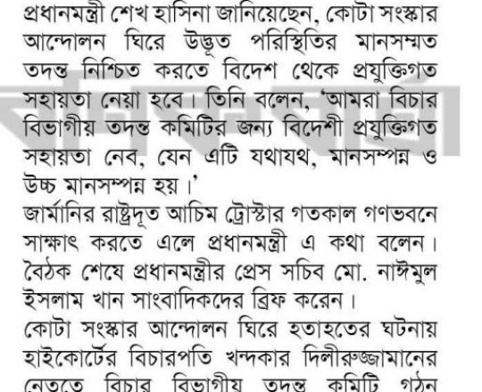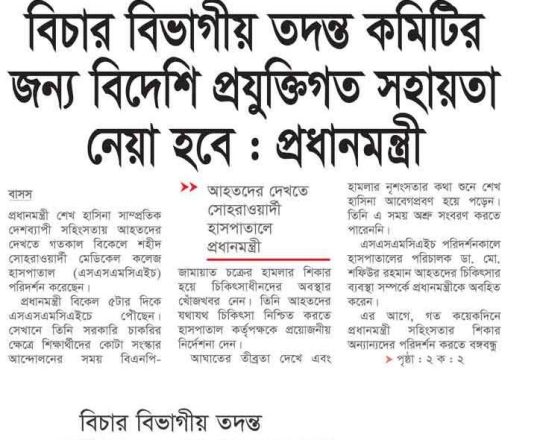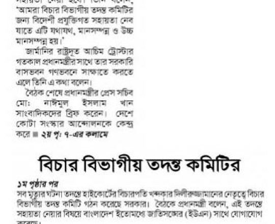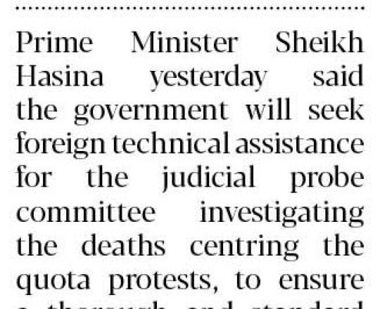 প্রথম আলো,৩১ জুলাই,বিচার বিভাগীয় তদন্ত কমিটির জন্য বিদেশি কারিগরি সহায়তা নেওয়া হবে: প্রধানমন্ত্রী