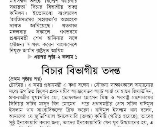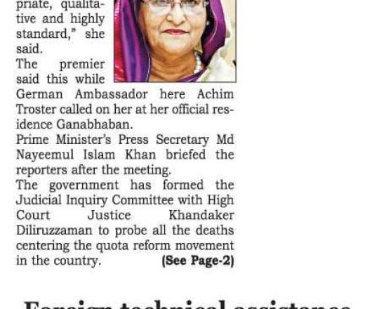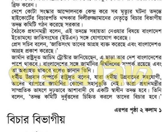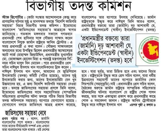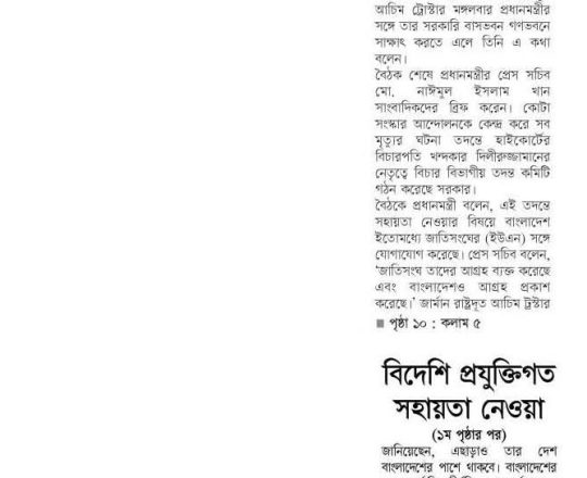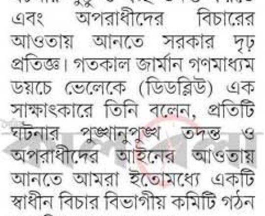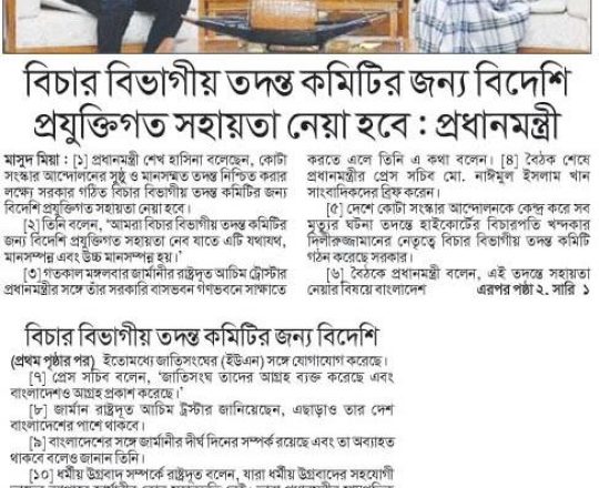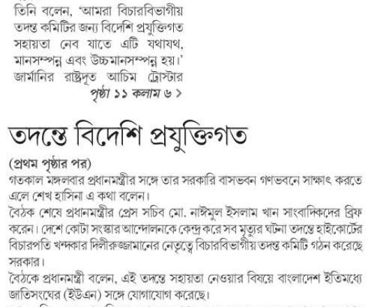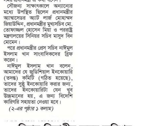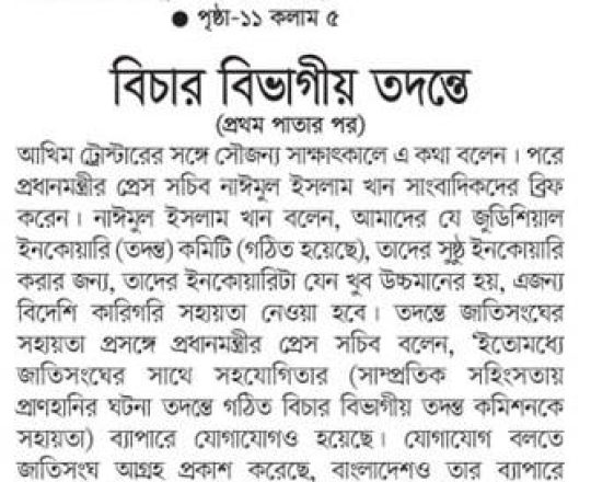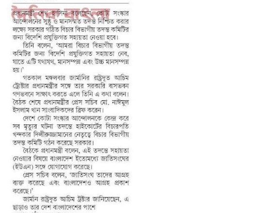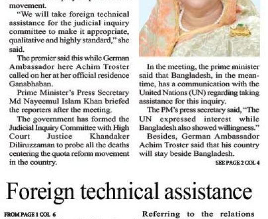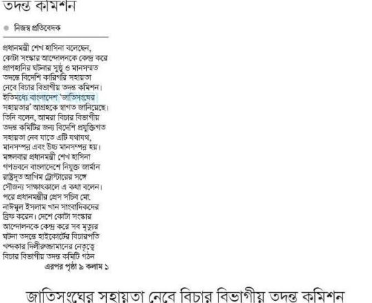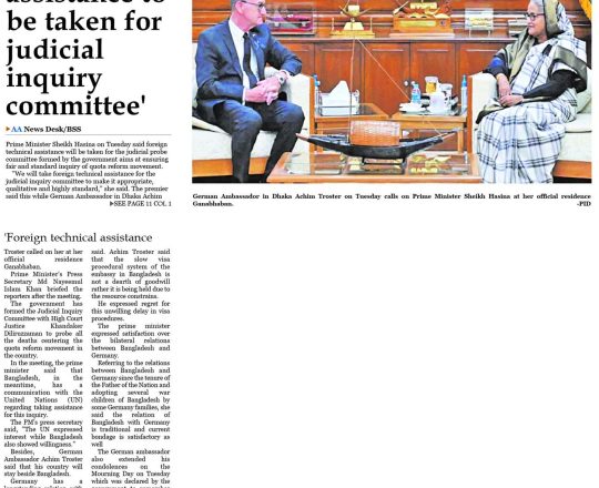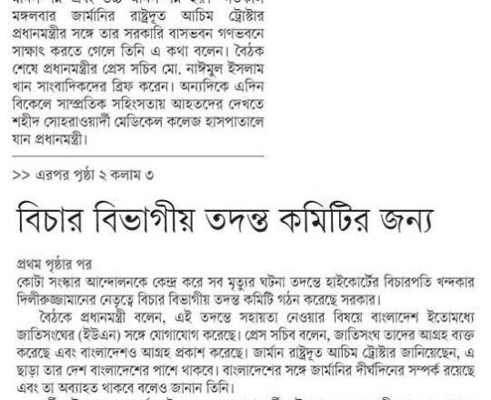 প্রথম আলো,৩১ জুলাই,বিচার বিভাগীয় তদন্ত কমিটির জন্য বিদেশি কারিগরি সহায়তা নেওয়া হবে: প্রধানমন্ত্রী