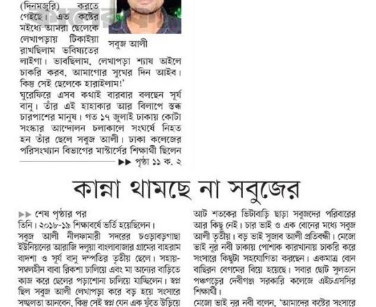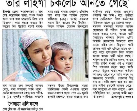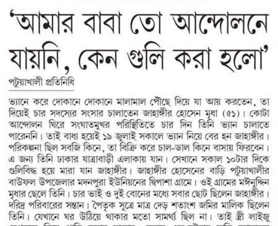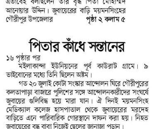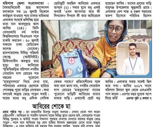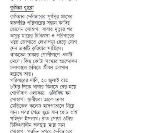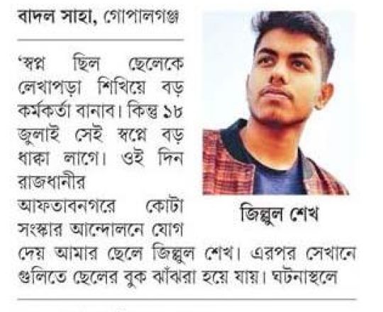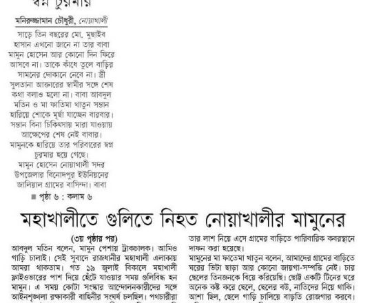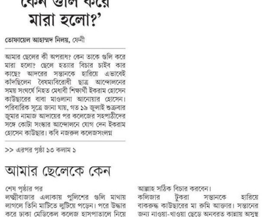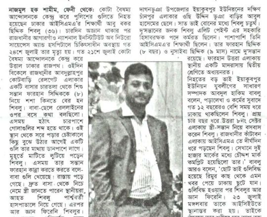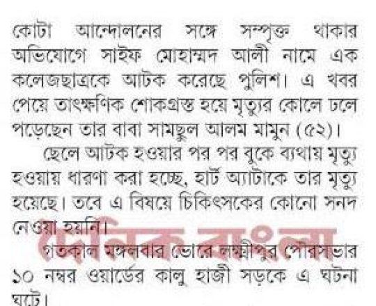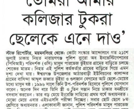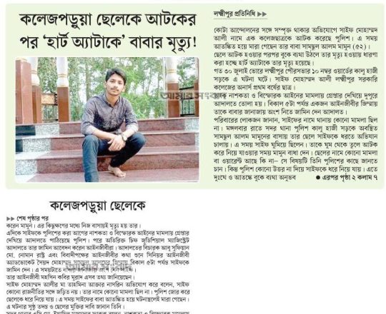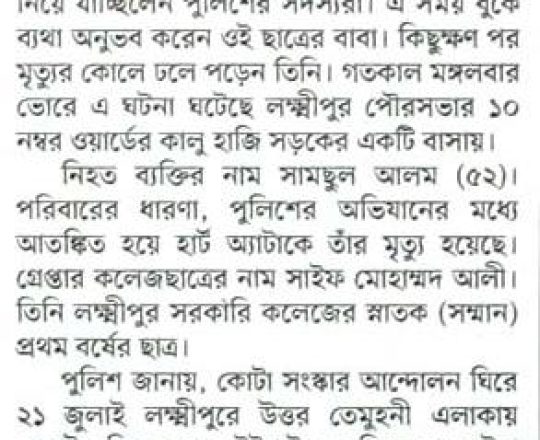 প্রথম আলো,৩১ জুলাইকোটিন মাত্মার আন্দোলন লক্ষ্মীপুরে কলেজপড়ুয়া ছেলেকে গ্রেপ্তারের পর বাবার মৃত্যু