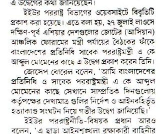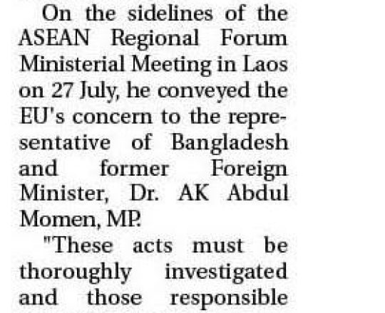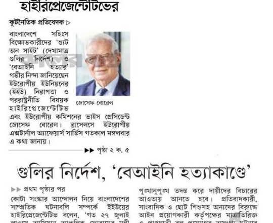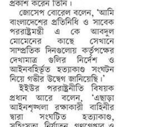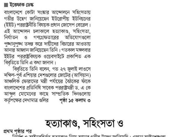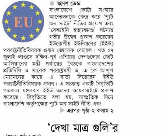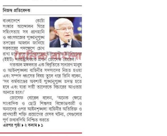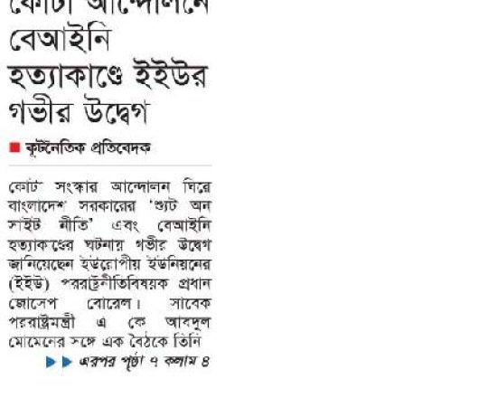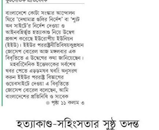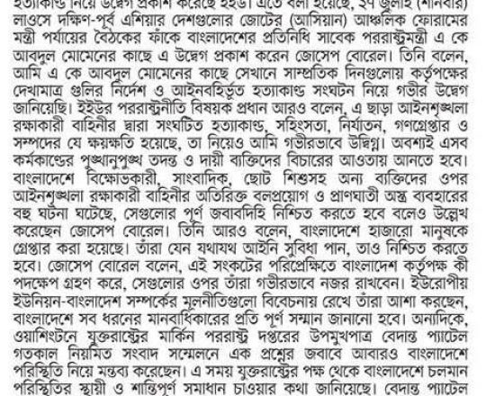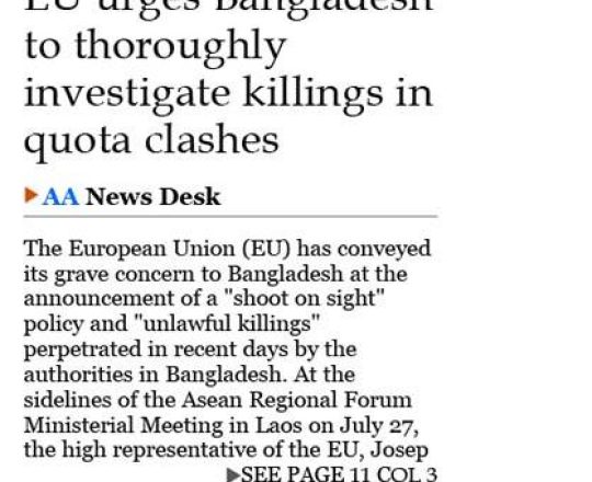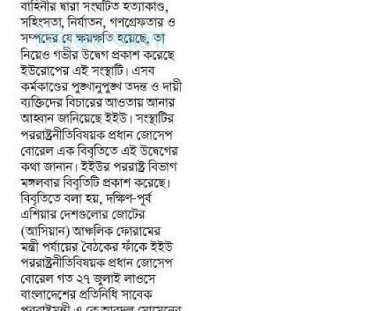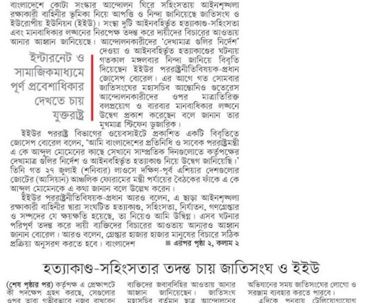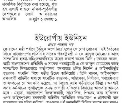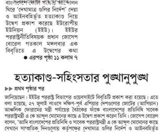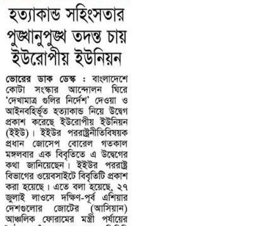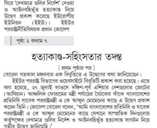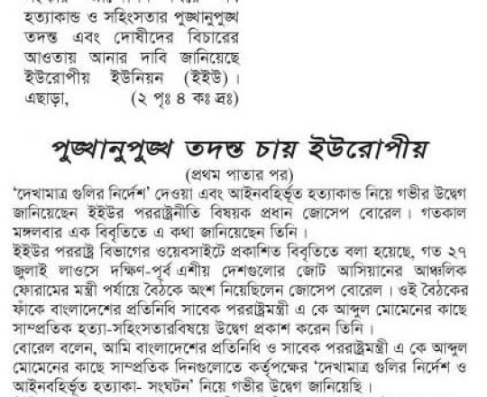 প্রথম আলো,৩১ জুলাই,হত্যাকাণ্ড-সহিংসতার পুঙ্খানুপুঙ্খ তদন্ত চায় ইউরোপীয় ইউনিয়ন