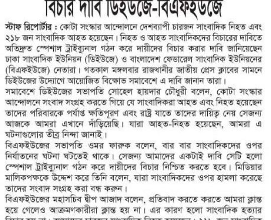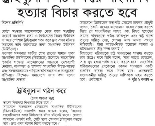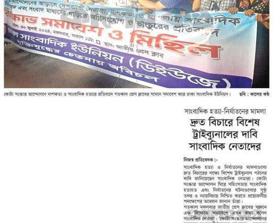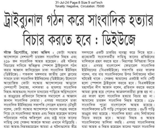 স্বদেশ প্রতিদিন, ৩১ জুলাই ২০২৪, ট্রাইব্যুনাল গঠন করে সাংবাদিক হত্যার বিচার করতে হবে-ডিইউজে
