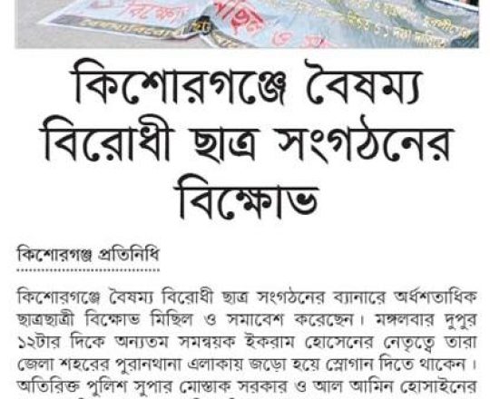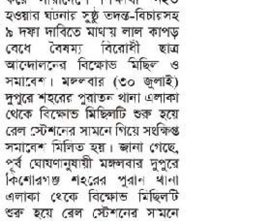 প্রথম আলো,৩১ জুলাই, কিশোরগঞ্জ শহরে লাল কাপড় মাথায় বেঁধে শিক্ষার্থীদের বিক্ষোভ