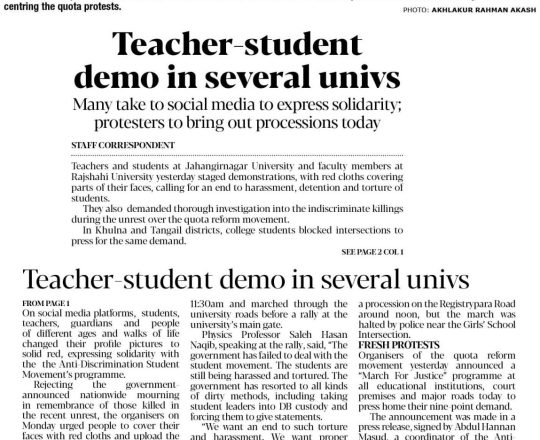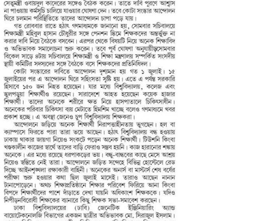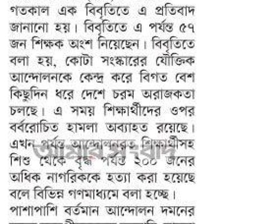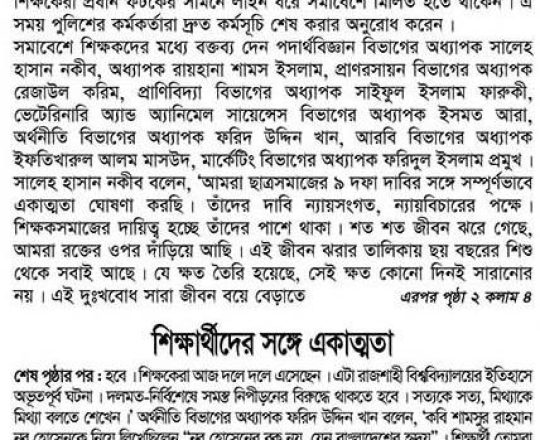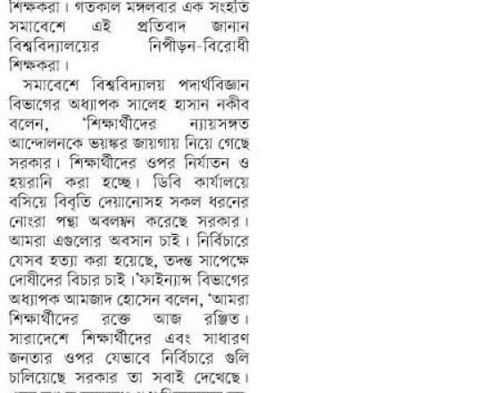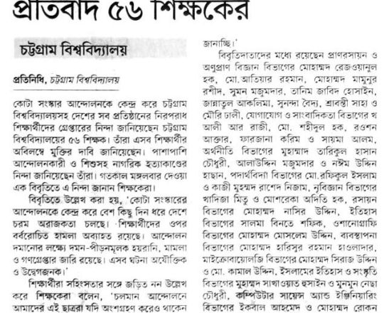 প্রথম আলো,৩১ জুলাই,শিক্ষার্থীদের মুক্তি ও হত্যাকাণ্ডের প্রতিবাদ ৫৬ শিক্ষকের
