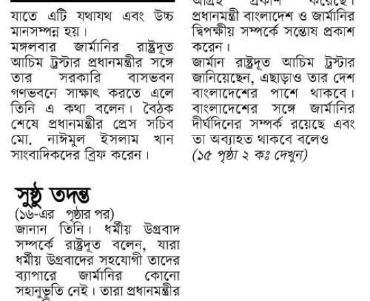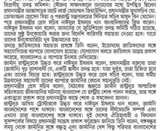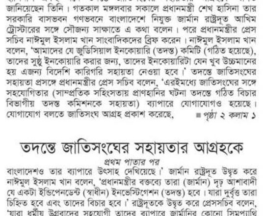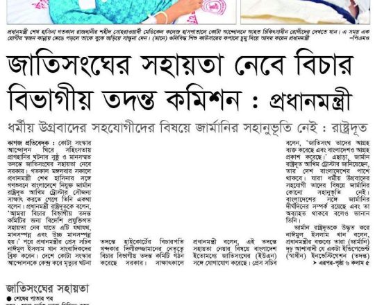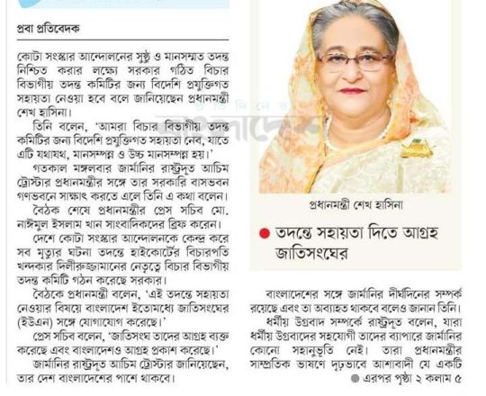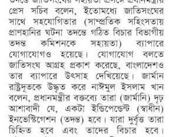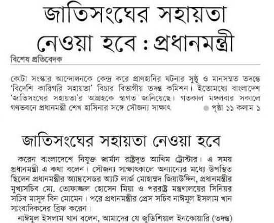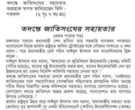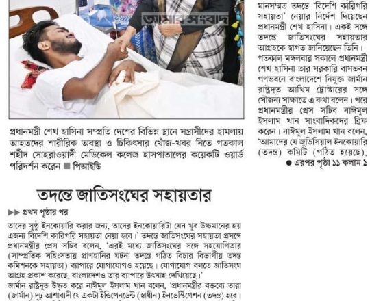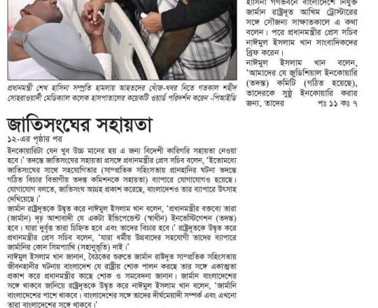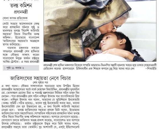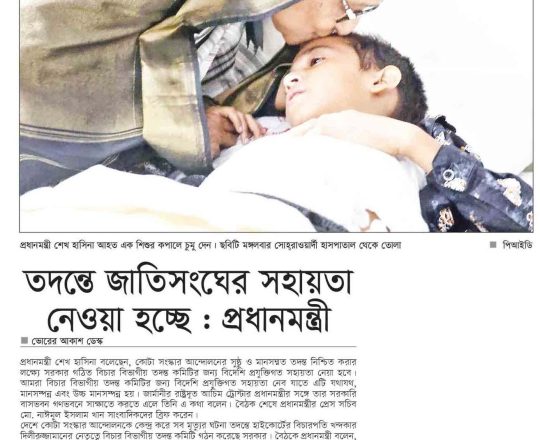 প্রথম আলো,৩১ জুলাই,সুষ্ঠু তদন্তে জাতিসংঘসহ আন্তর্জাতিক সংস্থার সহযোগিতা চেয়েছেন প্রধানমন্ত্রী