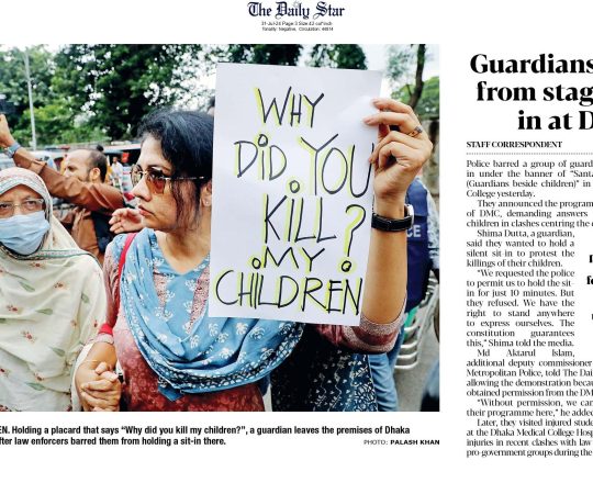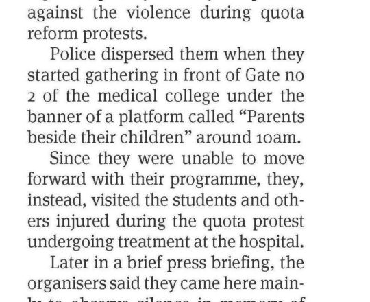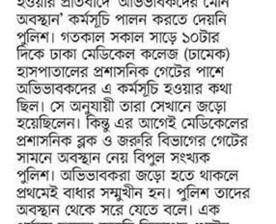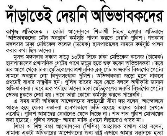 আজকের পত্রিকা, ৩১ জুলাই ২০২৪, ঢাকা মেডিকেল কলেজ হাসপাতালের সামনে মৌন অবস্থান কর্মসূচি করতে গিয়েছিলেন একদল অভিভাবক