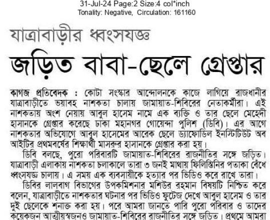 স্বদেশ প্রতিদিন, ৩১ জুলাই ২০২৪, সন্তানের খোঁজে এসে ডিবির হাতে বাবা-ভাই 'গ্রেপ্তার'