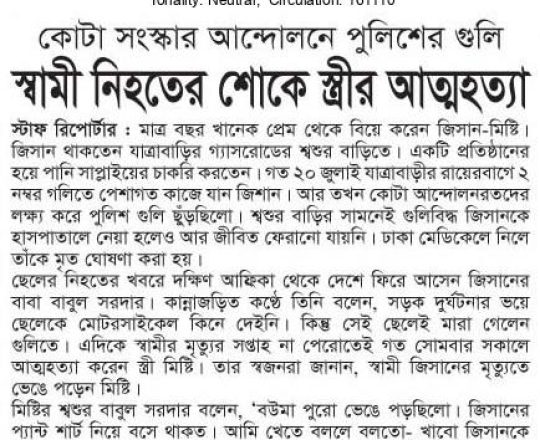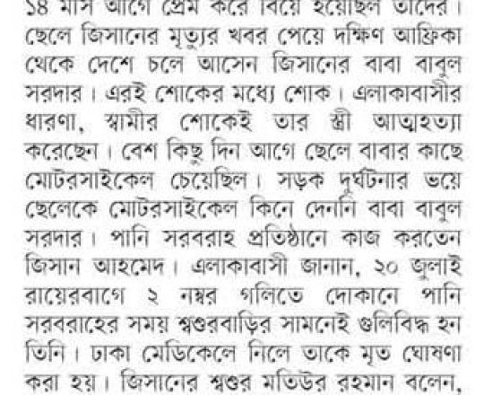 ভোরের আকাশ, ৩১ জুলাই ২০২৪, গুলিবিদ্ধ স্বামীর মৃত্যুর দুদিন পর স্ত্রীর আত্মহত্যা