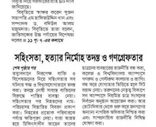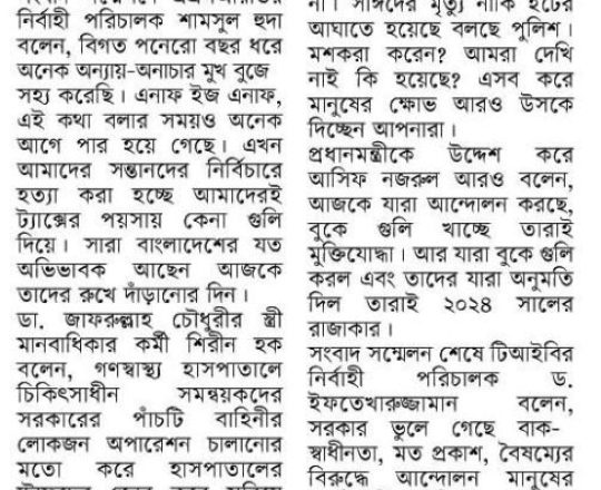 আজকের পত্রিকা, ৩১ জুলাই ২০২৪, সহিংসতা, হত্যার স্বচ্ছ তদন্তসহ ৯ দফা দাবি সুজনের