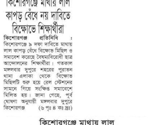 প্রথম আলো,৩১ জুলাই,কিশোরগঞ্জ শহরে লাল কাপড় মাথায় বেঁধে শিক্ষার্থীদের বিক্ষোভ