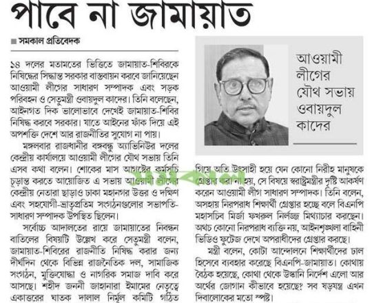 আজকের পত্রিকা, ৩১ জুলাই ২০২৪, জামায়াত যেন ফাঁকফোকরে সুযোগ না পায় -ওবায়দুল কাদের