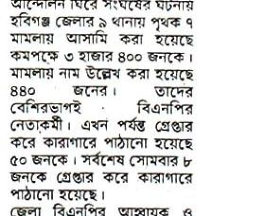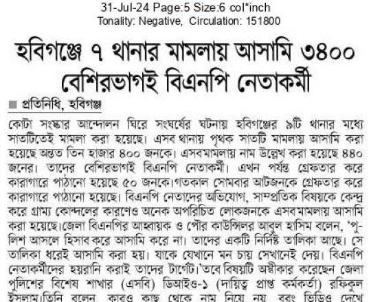 ভোরের পাতা, ৩১ জুলাই ২০২৪, হবিগঞ্জে ৭ থানার মামলায় আসামি ৩৪০০ বেশিরভাগই বিএনপি নেতাকর্মী