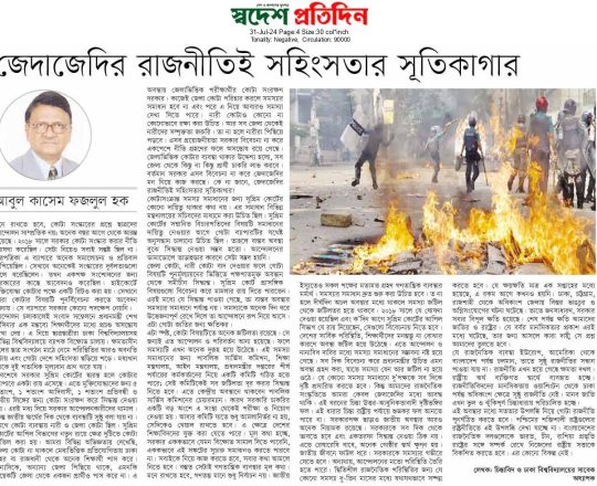 স্বদেশ প্রতিদিন, ৩১ জুলাই ২০২৪, জেদাজেদির রাজনীতিই সহিংসতার সূতিকাগার