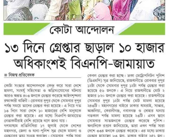 ভোরের আকাশ, ৩১ জুলাই ২০২৪, ১৩ দিনে গ্রেপ্তার ছাড়াল ১০ হাজার অধিকাংশই বিএনপি-জামায়াত