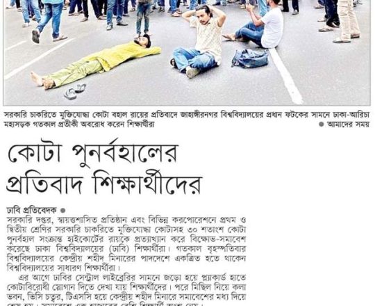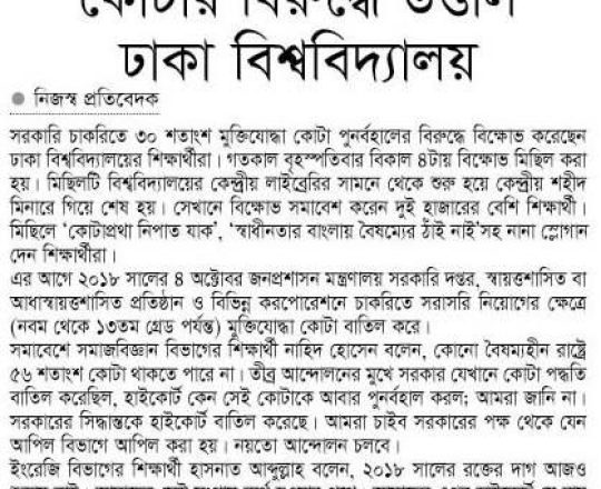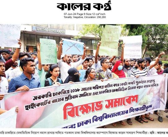 কালের কণ্ঠ, ৭ জুন ২০২৪, সরকারি চাকরিতে মেধাভিত্তিক নিয়োগ বহাল রাখার দাবিতে গতকাল ঢাকা বিশ্ববিদ্যালয় ক্যাম্পাসে বিক্ষোভ করেন সাধারণ শিক্ষার্থীরা।