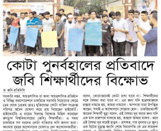 মানবজমিন, ৭ জুন ২০২৪, কোটা বহালের প্রতিবাদে বিক্ষোভ