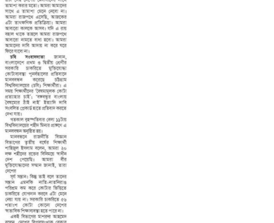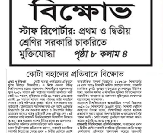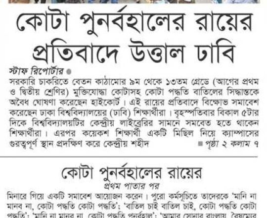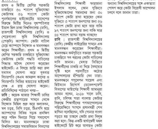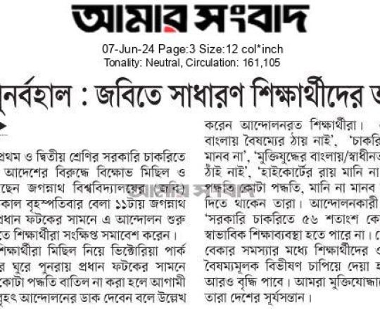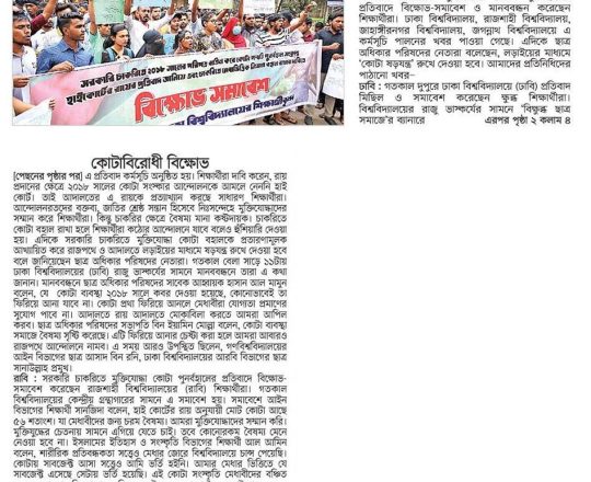 বাংলাদেশ প্রতিদিন, ৭ জুন ২০২৪, কোটাবিরোধী বিক্ষোভ বিশ্ববিদ্যালয়ে