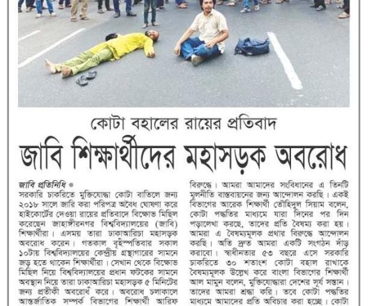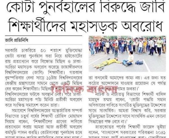 দৈনিক বাংলা, ৭ জুন ২০২৪, কোটা পুনর্বহালের বিরুদ্ধে জাবি শিক্ষার্থীদের মহাসড়ক অবরোধ