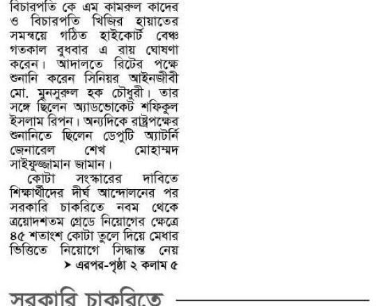 ভোরের কাগজ, ৭ জুন ২০২৪, পরিপত্র অবৈধ সরকারি চাকরিতে মুক্তিযোদ্ধা কোটা বহাল